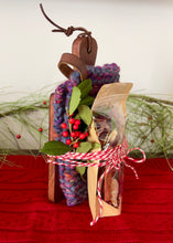 Includes: mini wood cheese board (10x5 inches), wool/cotton blend potholder w/leather loop (approx. 8x8 I ches), bag of simmering potpourri.